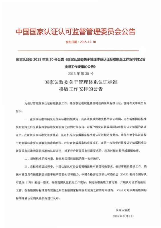 國家認監委2015年第30號公告《國家認監委關(guān)于管理體系認證標準換版工作安排的公告換版工作安排的公告》